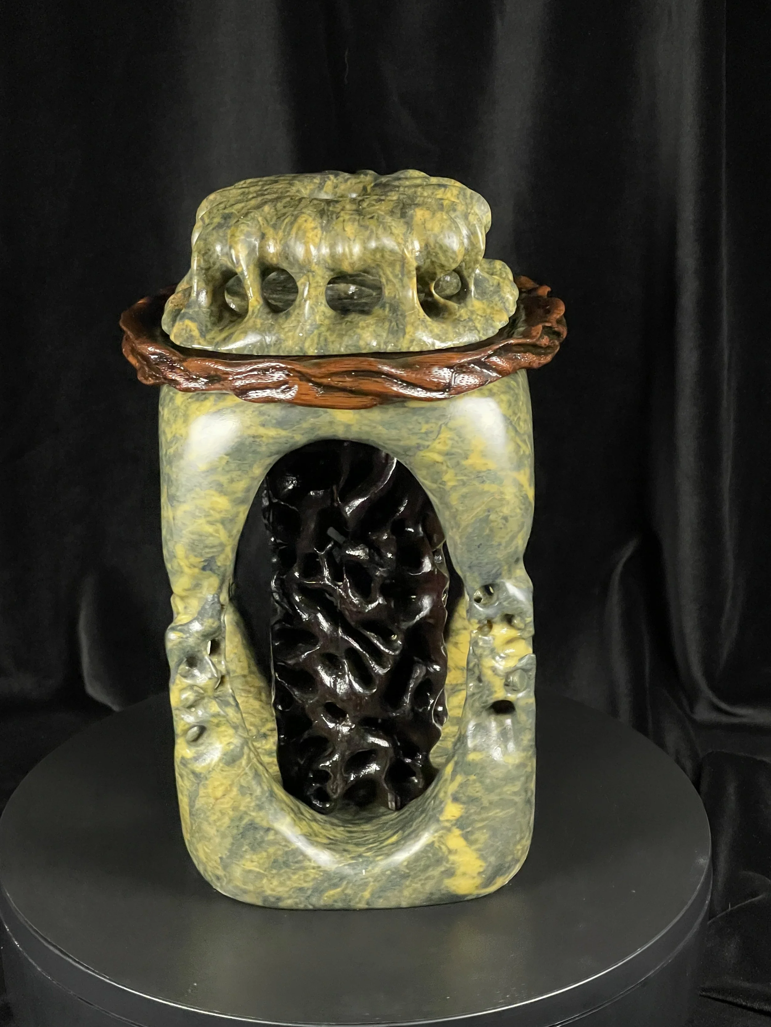 "Out of Stone" 2024 14"x8"x8" Stone (Chlorite) and Wood (Walnut)